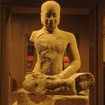 Of particular interest in the gallery are two masterpieces from the Angkorian Period (late 12th – early 13th century) – sandstone statues, both in the style of Bayon. Look for “Buddha Sheltered by Naga” and “Sumedha Hermit”. And don’t miss the Mona Lisa Buddha over on the left wall … No doubt about it – this Buddha has eyes for you! Ask a guard for help finding it.